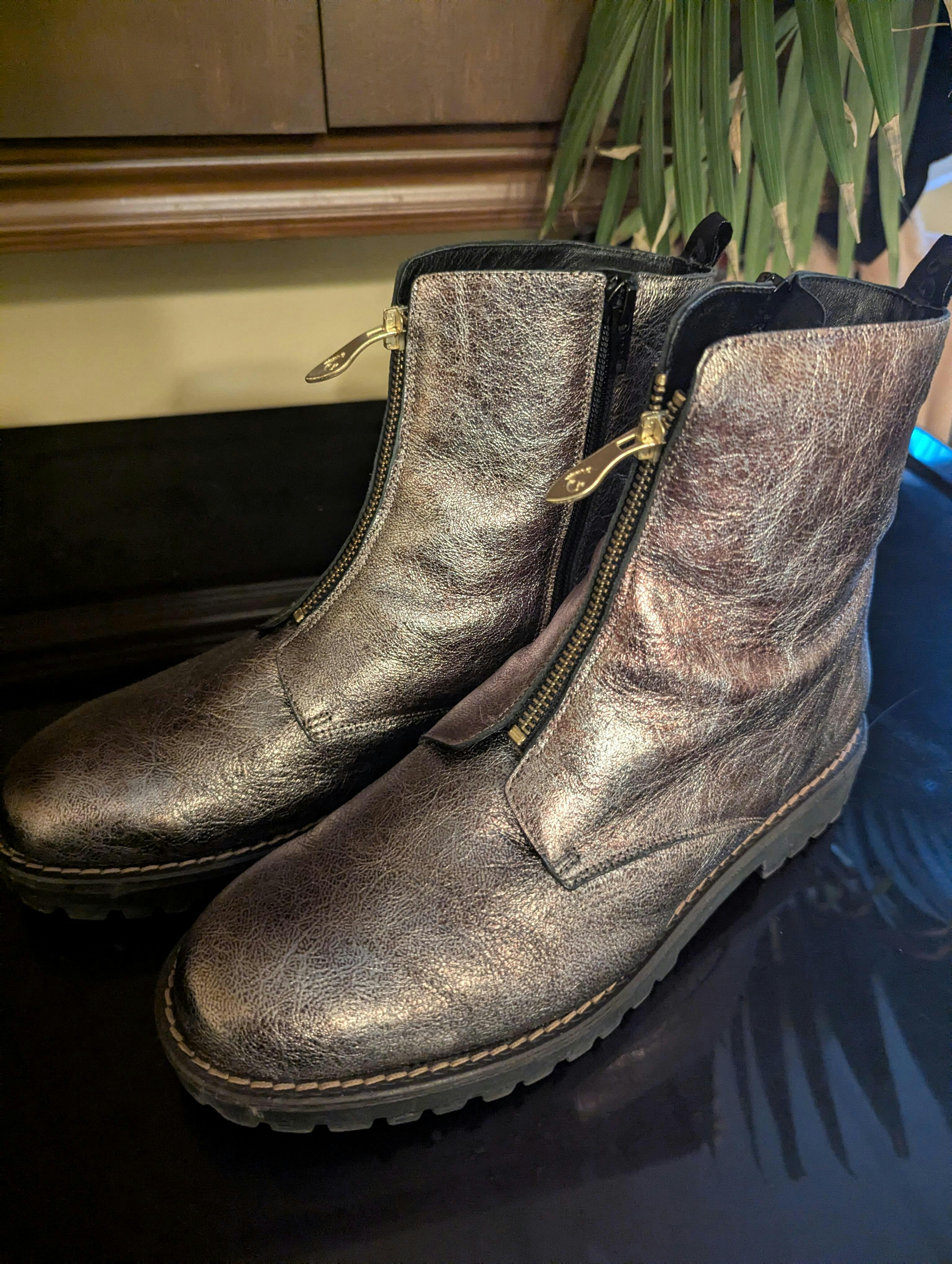 Add a little attitude to your outfit with this combat-boot style. A style that's easy to slip on thanks to its double zip (inside and front) and easy to walk in for long periods of time! Features an extra-padded insole and stretch leather lining.